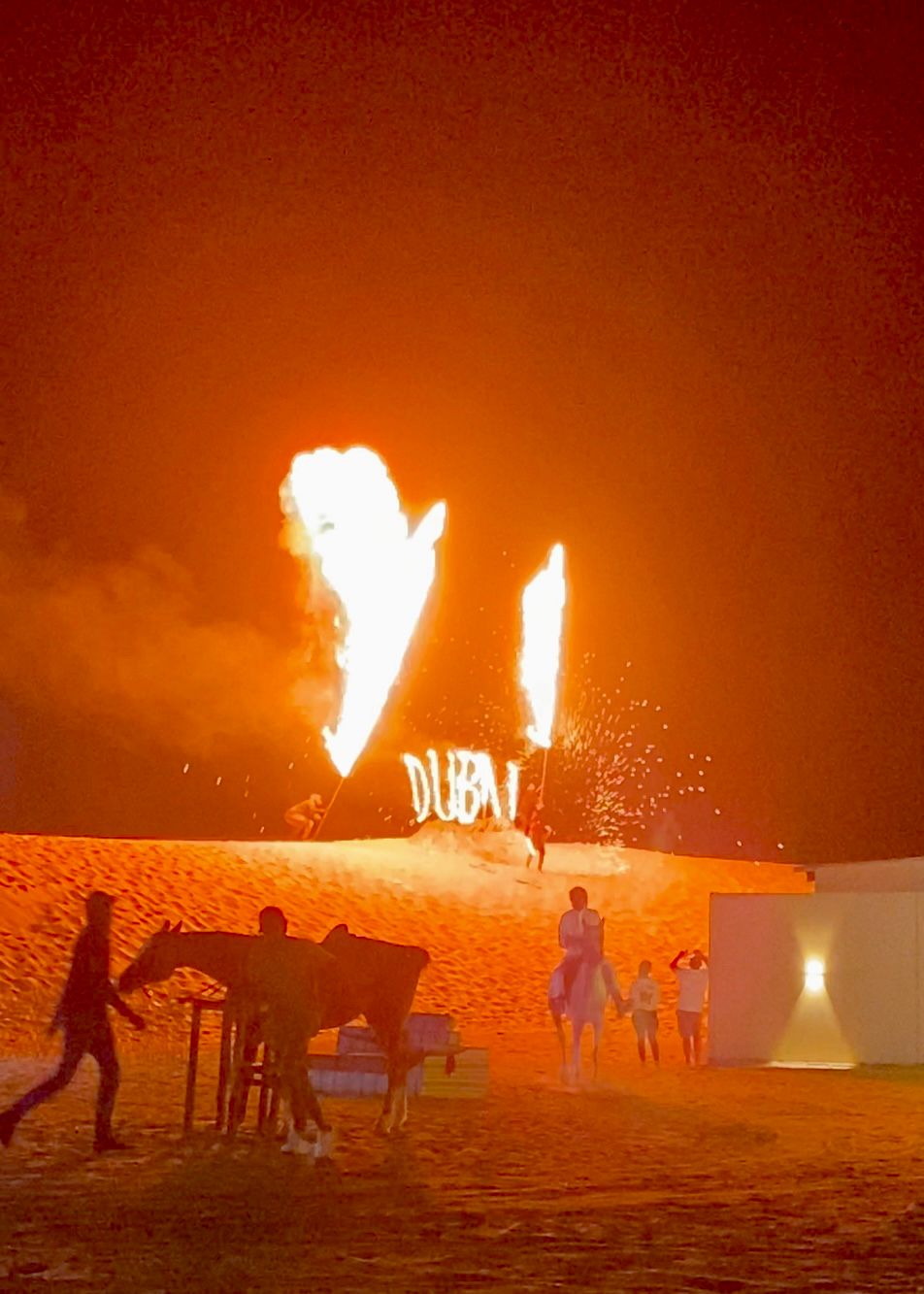 The evening ended with the lighting of a giant Dubai sign in the sand, alongside a fire performance.